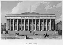 - Voir Édouard Baldus, La Bourse, photographie prise entre 1851 et 1870, alors que la façade du bâtiment porte encore l'inscription « Bourse et Tribunal de Commerce ».
