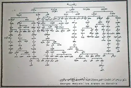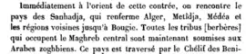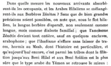De plus, comme le précise Ibn Khaldoun, on cite aussi parmi elles la tribu de Rebiâ, mais nous ne connaissons à présent aucune peuplade de ce nom, à moins que ce soit celle qu’on appelle les Maaqil, ainsi que le lecteur verra plus tard. Avec la tribu de Hilal, il entra en Ifrikya une foule mélangée, composée d’Arabes appartenant aux tribus des Fezara et d’Achedja (branches de celle de Ghatafan), de Djochem Ibn Muawya Ibn Bekr Ibn Houazen, de Seloul Ibn Morra Ibn Sâasâa Ibn Muawya, d’El-Maqil, branche de la grande famille des Arabes yéménites, d’Aniza Ibn Asad Ibn Rebiâ Ibn Nizar, de Thawr ibn Muawya Ibn Abbada Ibn Rebiât el Bekka Ibn Amer Ibn Sâasâa, d’Adouan Ibn Omar Ibn Caïs Ibn Ghaylan, et de Matrud, famille de a tribu de Fahm Ibn Qays. Mais toutes ces fractions de tribu étaient, pour ainsi dire, englobées dans la tribu de Hilal et surtout dans la tribu-branche d’El-Athbedj, parce que cette famille exerçait le commandement sur toutes les autres lors de leur entrée eu Ifrikya."[9]