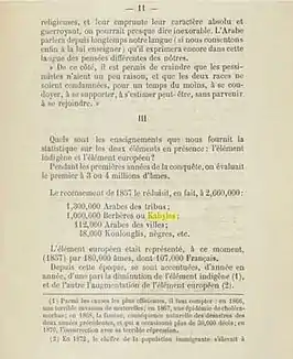 À l'aube de la colonisation française de l'Algérie, le pays est alors peuplé majoritairement de tribus arabes, dans lesquelles certaines tribus berbères se sont fondues dans le cadre de confédération tribale, ainsi que de tribus berbères. Toutefois, les Arabes et les Berbères ne formant pas deux ethnies différentes, mais seulement deux groupes linguistiques distincts, il est plus juste de parler d'une population arabo-berbère[2].
