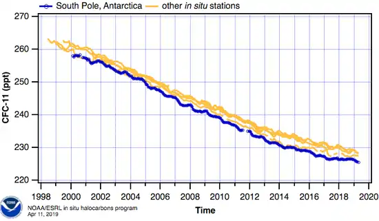 Grâce au Protocole de Montréal[12], sa concentration dans l'atmosphère a décliné régulièrement dès le milieu des années 1990[11], mais moindrement depuis 2012, probablement à la suite d'une reprise illégale de sa production industrielle dans l'est de la Chine[11].