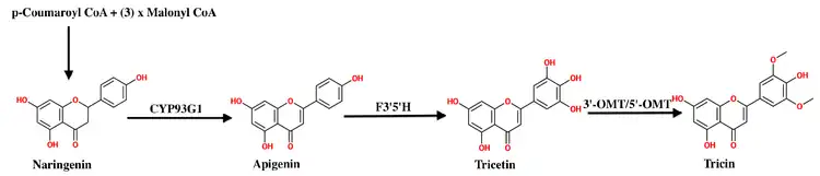 Si la biosynthèse totale des flavones n'a pour l'instant pas été identifiée complètement, la plupart des étapes du mécanismes ont elles été identifiées et étudiées. La première partie de la biosynthèse de la tricine inclut l'addition de malonyl-CoA, produit par la voie des polycétides, et de p-coumaroyl-CoA produit par la voie des phénylpropanoïdes[5]. Cette série des réactions est biocatalysées par les actions successives de la chalcone synthase et de la chalcone isomérase, pour former la naringinine chalcone (en), puis la flavanone naringinine. CYP93G1, une hémoprotéine de la famille des CYP450 désaturate ensuite la naringinine en apigénine. À ce stade, il a été proposé qu'une enzyme, la flavonoïde 3'5'-hydroxylase (F3’5’H), catalyse la transformation de l'apigénine en tricétine[6]. Enfin, cette dernière subit l'action de la 3'-O-méthyltransferase et de la 5’-O-méthyltransferase qui ajoute des groupes méthoxy pour former la tricine.