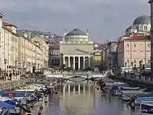 Trieste (de h. en b. et de g. à d.) : la piazza Unità d'Italia, le Grand Canal et au fond l'église catholique Sant'Antonio Taumaturgo, l'église serbo-orthodoxe de la Sainte-Trinité-et-Saint-Spiridion, une ruelle de Trieste, le château de Miramare, le Molo Audace (it). | ||||