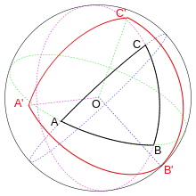 Pour un triangle ABC tracé sur une sphère, on appelle C' le pôle du plan (OAB) situé sur le même hémisphère que C. On construit de même les points A' et B'. Le triangle (A'B'C') est appelé le triangle polaire du triangle ABC.
