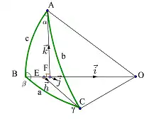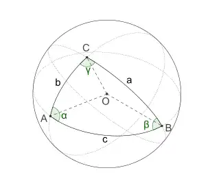 On considère trois points A, B et C sur une sphère comme représentés par la figure ci-contre, ainsi que les arcs de grands cercles qui les relient. On note α (parfois ) l'angle du triangle au sommet A, et de façon analogue pour les autres sommets. On note a, b et c les angles sous-tendus au centre O de la sphère par la partie de grand cercle correspondante. Ainsi a désigne l'angle , etc.