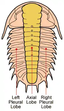 Il a pour caractéristique d'être composé de segments articulés les uns avec les autres (segments mobiles). Le nombre de segments dans cette région du corps varie de 2 à 103 (Balcoraccania dailyi[8]). Un trilobite possédant un nombre inférieur ou égal à 3 segments est qualifié de myomera, s'il possède plus de 3 segments, il est qualifié de polymera. Les segments du thorax forment parfois deux ensembles morphologiques distincts chez certaines formes primitives. On parle alors de « prothorax », pour la partie antérieure, et d'« opisthothorax », pour la partie postérieure. Le nombre élevé de segments offre une grande souplesse au thorax favorisant ainsi une position de défense par enroulement comme on peut l'observer chez d'autres arthropodes.