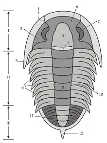 Le céphalon se compose de cinq (peut-être six) segments que l'on rassemble sous le terme de « glabelle ». Elle peut présenter trois types de morphologie : pointue (rétrécie vers l'avant), arrondie ou sphérique (morphologie archaïque) et élargie vers l'avant. Le segment le plus en avant forme l'anneau occipital, il joue un rôle important dans la détermination des trilobites. Parmi les segments suivants on trouve : un segment portant les yeux composés, un autre portant une paire d'antennes uniramées (i.e. à une seule branche) et trois segments portant chacun une paire de segments biramés (i.e. à deux branches).