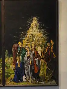 Le panneau central du triptyque représente la descente de croix ; les deux panneaux latéraux les saints patrons des armées.