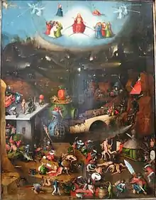 Or, Friso Lammertse souligne que les volets latéraux, contrairement à ceux du Chariot du foin, représentent déjà les vices : il lui semble donc peu probable qu'une scène du même genre ait également figuré au centre. Il juge donc plus plausible une représentation du Jugement dernier[15], thème notamment traité par Bosch au centre d'un triptyque conservé à Vienne. Il rejoint en cela une hypothèse de Jos Koldeweij, qui voit dans ce sujet apocalyptique la conclusion logique des péchés dénoncés sur les volets[7].