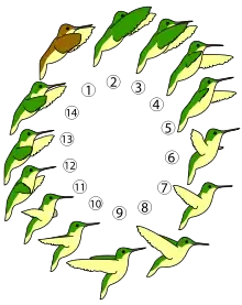 Une minorité d'espèces effectue des migrations sur de longues distances. Les vols migratoires s'effectuent presque toujours au-dessus de la terre ferme. Ils sont entrecoupés de haltes plus ou moins longues qui dépendent notamment de l'abondance des sources de nourriture. Ainsi, sept espèces de colibris nichant dans la moitié occidentale des États-Unis migrent vers le Mexique en passant en août au-dessus des prairies montagnardes où il semble qu'elles suivent la floraison des plantes herbacées[33]. Le colibri roux est celui qui effectue la plus longue route migratoire. Il migre de l'Alaska aux régions du nord et du centre du Mexique. Le colibri à gorge rubis est un autre migrateur pouvant traverser d'une seule traite le golfe du Mexique et parcourant ainsi environ 1 000 km sans aucune halte possible.