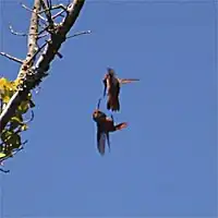 On connaît également une autre parade réalisée par les deux opposants simultanément, qu'on appelle « vol vertical » : les individus volent de haut en bas sur une certaine hauteur en se faisant face à une distance de moins d'1 mètre l'un de l'autre. Cette dernière parade peut être accompagnée de gazouillis.