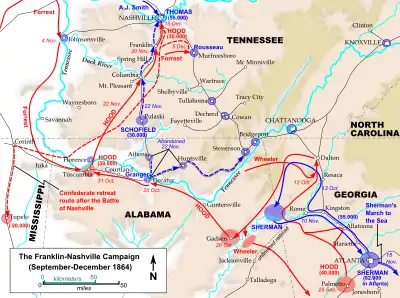 En , pour obliger l'armée du général Sherman à quitter la Géorgie, le général John Bell Hood conduit l'armée du Tennessee vers le nord, visant la capture de la ville de Nashville, important centre de ravitaillement nordiste. En dépit des fortes pertes subies à la bataille de Franklin, il continue sa progression vers Nashville.