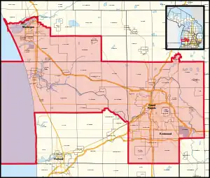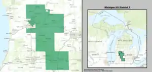 Aucun Démocrate n'avait représenté Grand Rapids au Congrès depuis Richard Vander Veen de 1974 à 1977, avant le redécoupage dû au recensement de 1990, qui est entré en vigueur en 1993 et a déplacé Grand Rapids du 5e au 3e district du Congrès. Cependant, à la suite du recensement de 2020, le 3e district a été à nouveau redessiné[2], et lors des élections de mi-mandat de 2022, la candidate démocrate Hillary Scholten a été choisie pour représenter le district[3].