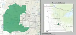 Le 3e district congressionnel du Minnesota englobe les banlieues des comtés de Hennepin et Anoka à l'ouest, au sud et au nord de Minneapolis. Le district, qui a principalement un caractère suburbain, comprend quelques communautés agricoles à l'extrême ouest ainsi que des zones suburbaines intérieures à l'est. Le district comprend les villes cols bleus de Brooklyn Park et Coon Rapids au nord-est, Bloomington aux revenus moyens au sud et Eden Prairie, Edina, Maple Grove, Plymouth, Minnetonka et Wayzata à l'ouest. Le Démocrate Dean Phillips représente actuellement le district à la Chambre des Représentants des États-Unis, après avoir battu le Républicain sortant Erik Paulsen aux élections de mi-mandat de 2018.