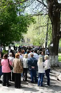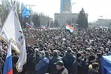 Un rassemblement devant le bâtiment du SBU pour élire un « gouvernement populaire » à Louhansk a lieu le 21 avril[161],[162],[163]. Lors du rassemblement, les manifestants appellent à un référendum le 11 mai sur le statut de l'oblast de Louhansk avec trois options : faire partie d'une fédération ukrainienne, rejoindre la fédération de Russie ou rester dans une Ukraine unitaire. Environ 1 500 participants sont observés au plus fort de la mobilisation[161]. Les dirigeants du rassemblement déclarent qu'ils ne se considèrent pas séparatistes et recherchent une solution pacifique, qui permettrait à l'oblast de Louhansk de demeurer partie intégrante de Ukraine[161],[162].