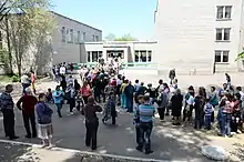 Des tracts publiés par la république populaire de Donetsk sont distribués le 26 avril, informant les citoyens d'un référendum sur la question de savoir s'ils soutiennent ou non la proclamation de la « souveraineté de l'État » par la République[106] qui se tiendra le 11 mai. Le lendemain matin, deux membres de la mission spéciale d'observation de l'OSCE sont détenus par un groupe d'hommes non armés de la milice populaire du Donbass à Ienakiieve[106]. Ils sont emmenés à l'hôtel de ville occupé, interrogés, puis relâchés après qu'une lettre envoyée par le bureau de la mission à Kiev ait confirmé les pouvoirs des contrôleurs[106]. Un grand rassemblement pro-gouvernemental dans la ville de Donetsk a défilé pour protester contre la violence dans l'oblast de Donetsk et la tentative d'assassinat du maire de Kharkiv, Hennadiy Kernes, le 28 avril[107]. Le rassemblement est rapidement et violemment dispersé par des séparatistes armés de battes de baseball, de barres de fer, de pétards et de boucliers[107].