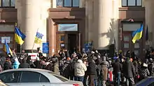 Les troubles se sont d'abord emparés de la ville de Kharkiv le 22 février 2014, lorsque des manifestants d'Euromaïdan ont occupé le bâtiment de l'administration régionale de l'État (RSA) de la ville[181],[182]. Plus tard dans la journée, plusieurs milliers de manifestants tente de renverser une statue de Vladimir Lénine qui se dresse en face du bâtiment RSA sur la place de la Liberté. Plusieurs chauffeurs de taxi défendent le monument, blessant plusieurs manifestants. Le lendemain, plusieurs milliers de manifestants pro-russes se rassemblent sur la place pour protéger la statue[183] et érigent une clôture périphérique autour. Le gouverneur de l'oblast de Kharkiv, Mikhaïl Dobkine, prononce un discours devant les défenseurs de la statue, affirmant que celle-ci représente « un symbole de notre ville... nous la laisserons ici et nous la défendrons »[181]. La police locale sépare les manifestants pro et anti-Maïdan jusqu'au 1er mars[184]. Ce jour-là, des militants pro-russes prennent d'assaut le bâtiment RSA, agresse les militants d'Euromaïdan qui l'occupent et hissent le drapeau russe au-dessus du bâtiment[185]. Certains des manifestants s'avèrent être des citoyens russes qui s'étaient rendus à Kharkiv depuis la Russie[186],[187]. Selon les médias locaux, 2 000 Russes ont été amenés par des bus immatriculés russes à Kharkiv pour participer à la prise d'assaut du bâtiment[188]. Des organisations militantes russes confirment avoir envoyé des Russes pour « manifester pacifiquement » à Kharkiv. La police reprend le contrôle du bâtiment dans la soirée du même jour et remplace le drapeau russe par celui de l'Ukraine[189],[190].