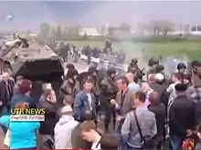 Le 16 avril, l'opération « anti-terroriste » menée par le gouvernement ukrainien dans l'oblast de Donetsk s'heurte à quelques obstacles[98]. Les manifestants saisissent des véhicules blindés ukrainiens à Kramatorsk et renvoient des soldats à Sloviansk[98]. Dans la nuit du 16 avril, environ 300 manifestants pro-russes attaquent une unité militaire ukrainienne à Marioupol, lançant des cocktails Molotov[99]. Le ministre des Affaires intérieures, Arsen Avakov, déclare que les troupes ont été forcées d'ouvrir le feu, entraînant la mort de trois des assaillants[99].