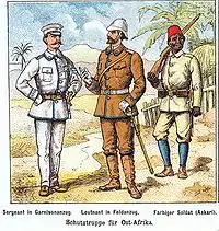 En Afrique orientale allemande, les engagés indigènes devinrent rapidement célèbres sous le nom d’« askaris » - désignation qui s'étendit finalement à toutes les troupes de volontaires africains. Elles servaient également comme forces de police et de maintien de l'ordre dans les colonies - les Polizeiaskaris.