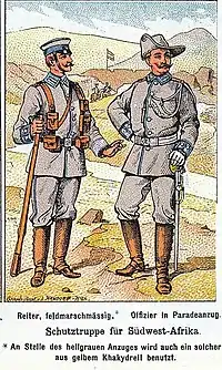 Les forces coloniales du Sud-Ouest africain allemand étaient constituées de volontaires de l'armée et de la marine impériale (incluant notamment des autrichiens), mais essentiellement constitués de membres de régiments allemands. Avant leur déploiement en Afrique, ces troupes furent préparées à leurs futures missions de défense ainsi qu'à leur futur environnement militaire. Un de ces lieux d'entrainement était la base située à Karlsruhe. Grâce aux conditions climatiques dans la vallée du Haut-Rhin du grand-duché de Bade, alliant chaleur et humidité, la zone fournissait une acclimatation rapide, semblable au climat que l'on pouvait retrouver dans le Sud-Ouest africain allemand.