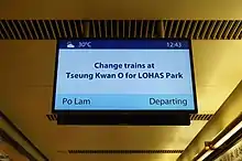 Message visuel invitant à changer de train à Tseung Kwan O pour LOHAS Park (Train pour Po Lam).