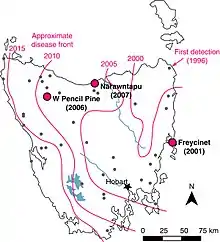 Cette histoire semble commencer avec un foyer d'épidémie détecté à l'est de la Tasmanie, qui depuis se propage régulièrement vers l'ouest (à partir de 2007 surtout)[60].