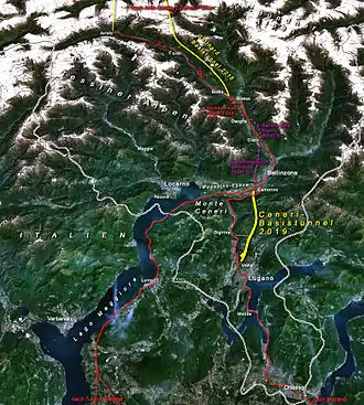 La ligne de base du Ceneri constitue la quatrième ligne à grande vitesse de Suisse[note 1]. À l'instar de la ligne de base du Gothard, la vitesse maximale est de 250 km/h.