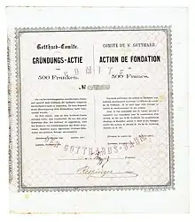 La ligne ferroviaire du Saint-Gothard et son tunnel furent concédés à la Compagnie du chemin de fer du Saint-Gothard, fondée le et présidée par le principal artisan de l'Union du Gothard, le Zurichois Alfred Escher (fondateur du Crédit Suisse). Afin de réunir les fonds nécessaires, la Compagnie fit appel aux deux grands pays intéressés par l'ouverture de cet axe de communication nord-sud : l'Allemagne[1] et l'Italie, signataires avec la Suisse d'un « traité du Gothard » (), investirent respectivement 20 et 45 millions de francs sur les 187 millions nécessaires. La Compagnie n'avait d'ailleurs pas hésité à soudoyer un député allemand, en lui versant 25 000 francs pour qu'il plaide la cause du projet au Reichstag.