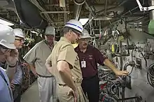 Susan Ford Bales devant les hélices du porte-avion le .