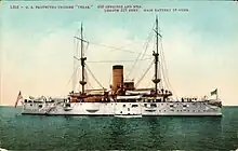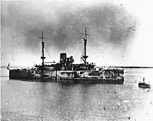 Le navire s'échoua près de Newport à Rhode Island en . Une erreur humaine associée à une défaillance du sonar furent accusés et quelques officiers, dont le futur gouverneur de Guam Alfred Walton Hinds, furent publiquement réprimandés[29]. Le , alors qu'il était en réparations à New York, l'attache sécurisant la vanne d'injection principale de la salle des machines tribord se cassa. La pression de l'eau fit sauter la valve et le compartiment fut inondé. Des fuites dans les portes étanches, les tubes acoustiques et les trous dans les cloisons étanches pour le passage des câbles électriques permirent à l'eau de se répandre dans l'autre salle des machines, les soutes à charbon et une grande partie des magasins. Le navire se posa sur le fond mais l'eau était peu profonde et cela facilita les efforts de renflouement. Le 11, une grande partie de l'eau avait été pompée mais son tirant d'eau était encore trop important pour qu'il puisse entrer dans la cale sèche. Près de 270 tonnes de charbon durent être enlevés pour l'alléger[30].