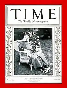 Nommé ministre des Affaires étrangères une troisième fois, de 1932 à 1933, dans le gouvernement de Saitō Makoto, il appelle à la reconnaissance diplomatique du Mandchoukouo et au retrait japonais de la Société des Nations. Il fait la couverture du Time du qui contient également un article sur sa position vis-à-vis de la Société des Nations. Il meurt de maladie 15 jours après l'incident du 26 février de 1936. Sa tombe se trouve au cimetière de Tama à Tokyo.