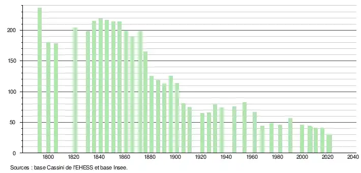 L'évolution du nombre d'habitants est connue à travers les recensements de la population effectués dans la commune depuis 1793. Pour les communes de moins de 10 000 habitants, une enquête de recensement portant sur toute la population est réalisée tous les cinq ans, les populations légales des années intermédiaires étant quant à elles estimées par interpolation ou extrapolation[30]. Pour la commune, le premier recensement exhaustif entrant dans le cadre du nouveau dispositif a été réalisé en 2005[31].