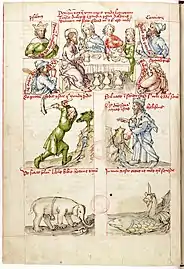 - Dans une rangée en-dessous, cette scène est expliquée et illustrée par deux images avec des correspondances de l'Ancien Testament