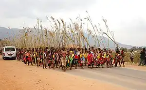En Eswatini, la cérémonie porte le nom d'Umhlanga. Les jeunes filles se rassemblent au village royal de la reine mère, qui est actuellement Ludzidzini. Après l'arrivée de la reine mère dans la résidence royale, les femmes se dispersent, la nuit suivante, dans les zones environnantes et coupent de grands roseaux. La nuit d'après, elles les regroupent et les apportent à la reine mère afin qu'ils soient utilisés pour la réparation des trous dans les barrières de roseaux entourant le village royal.
