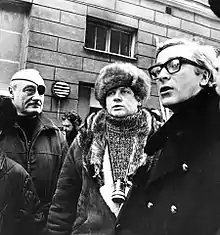 Le producteur André de Toth, le réalisateur Ken Russell et l'acteur Michael Caine lors du tournage du film à Helsinki.