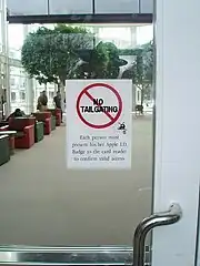 Dans le cadre de la sécurité des bâtiments, le terme de « Tailgating[1] » (ou « talonnage » en français) sert à décrire la situation où un ou plusieurs individus suivent une personne autorisée à travers un accès sécurisé, lorsque celle-ci a ouvert la porte légitimement, et à son insu. Un talonneur peut être un intrus non autorisé, mais également une personne normalement autorisée qui aurait trouvé la procédure d'accès incommodante. Les bâtiments de haute sécurité utilisent typiquement des portes à battants tournants pour empêcher le talonnage. Ces portes peuvent être plus étroites et plus rapides afin d'améliorer la sécurité, en plus des capteurs infrarouges peuvent également être rajoutés. En cas de détection de deux personnes, la porte tourne en sens inverse.