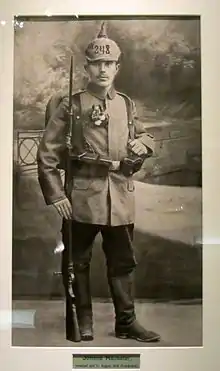 3- Le casque à pointe : signe distinctif du militaire allemand au point de symboliser à l'étranger l'impérialisme germanique, il équipe tous les soldats. Il est en cuir bouilli pour la coiffe et en métal pour les ornements (pointe, insignes...). Pendant les combats, il est recouvert d'une toile kaki. Le numéro du régiment est inscrit dessus en rouge. Le soldat a également un bonnet de police, Feldmütze en allemand, porté seulement lors des phases de repos.