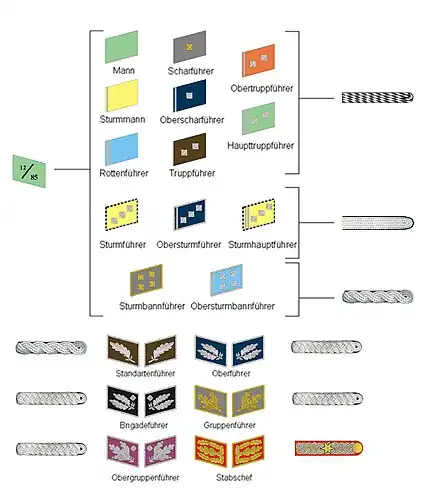 Ce tableau contient les derniers grades et insignes de la Sturmabteilung, qui étaient en usage de 1942 à 1945 par rapport à l'armée allemande.