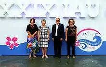 Le comité élu en 2018 : de gauche à droite, Ian Robson (Royaume-Uni, secrétaire général assistant en 2018-2019), Teresa Lago (Portugal, secrétaire générale), Ewine van Dishoeck (Pays-Bas, présidente) et Debra Elmegreen (États-Unis, présidente-élue).