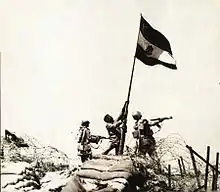 Le , l'Union des Républiques arabes, regroupant l’Égypte, la Libye et la Syrie, est proclamée lors d'une conférence à Benghazi[1]. L'Union des Républiques arabes est alors censée disposer d'une capitale, d'un drapeau unique ainsi que d'organes politiques communs (parlement fédéral, président), et d'une diplomatie et d'une armée communes : de 1972 à 1977, la Libye ajoute ainsi à son drapeau un faucon d'or (dit « de Quraych ») au centre, saisissant avec ses griffes un ruban portant l'inscription Union des Républiques Arabes (en arabe : اتحاد الجمهوريات العربية (ittiḥād al-jumhūriyyāt al-ʿarabiyya)). Le drapeau est le même que celui de l'Égypte et de la Syrie (de 1971 à 1980). Il ne se distingue des deux autres que par une petite cartouche sous le faucon portant le nom de l'État : République Arabe de Libye. Le de la même année, à la date anniversaire du coup d'État libyen, un référendum organisé simultanément dans les trois pays approuve le projet. Le , voulant aller plus loin dans l'unité, obtient de Sadate un accord prévoyant l'« union totale » entre l'Égypte et la Libye avant le : la Syrie n'est plus mentionnée dans cet aspect de l'accord[2],[3].