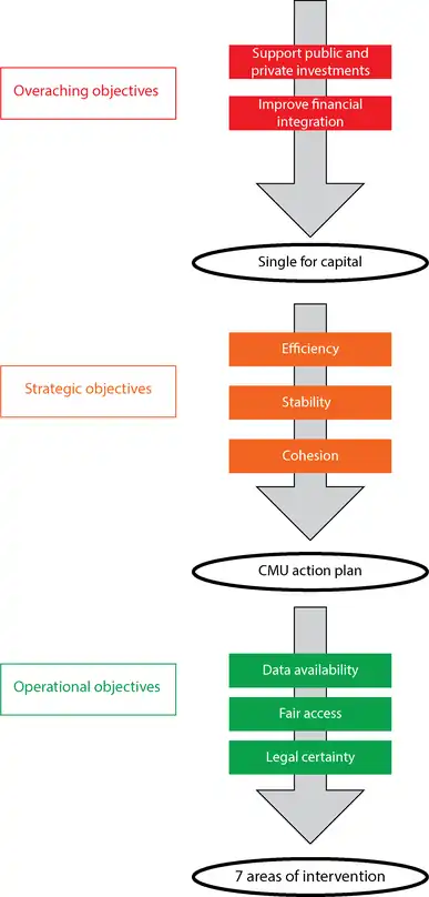 La Commission européenne a défini 3 niveaux d'objectifs différents pour l'Union des marchés des capitaux, des objectifs économiques mondiaux à la nécessité plus concrète de la construction d'un système financier intégré. Ces objectifs économiques encadrent les sept domaines d'intervention visés par le plan d'action[22].