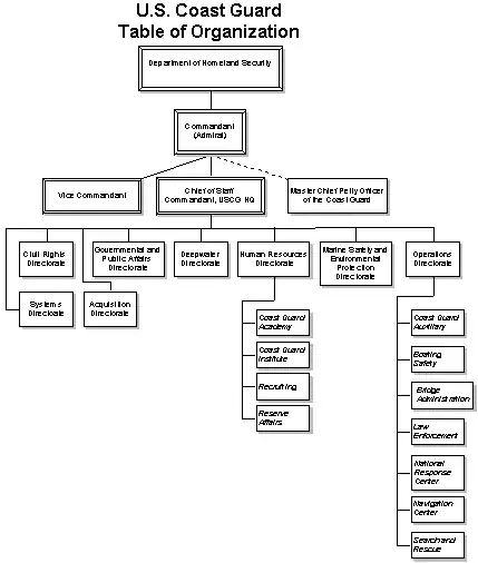 L'USCG est un organisme militaire, placé cependant, depuis 2003, sous l'autorité du département de la Sécurité intérieure, après l'avoir été sous celle du département des Transports des États-Unis. En cas de conflit, il est susceptible de passer sous la direction de la United States Navy.