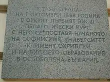 L’université Saint-Clément-d’Ohrid a été fondée le 1er octobre 1888, soit 10 ans après la libération de la Bulgarie qui mit fin à la domination ottomane[1]. L’idée d’une université nationale était déjà ancienne chez les patriotes bulgares. Elle fut créée comme école pédagogique, dans le but de former les enseignants dont le jeune État avait besoin. Pendant la première année de fonctionnement, l’établissement accueillit 49 étudiants, assistant aux cours de 7 enseignants, surnommés « les sept nouveaux saints » (par référence aux sept saints principaux de l’Église orthodoxe bulgare[2]) : Aleksandăr Teodorov-Badan, Ljubomir Miletič, Ivan Georgov, Nikola Mihajlovski, Josif Kovačev, Stanimir Stanimirov et Ivan Danev. Ils élurent le philologue Aleksandăr Teodorov-Badan comme premier recteur.