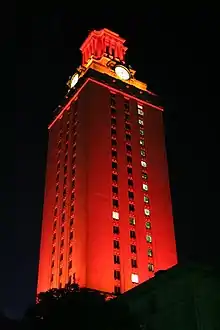 L’université du Texas à Austin s’étend sur quelque 3,4 km², dont 1,4 km² pour le principal campus. Le bâtiment principal (Main Building) de style Beaux-Arts comprend également la tour dessinée par Paul Philippe Cret[5]. Il fut achevé en 1937 et se trouve au centre du campus. La tour est éclairée d’une lumière blanche sauf lorsqu'une équipe de l’université remporte une victoire, ou lors de certaines occasions. Au sommet se trouve un carillon de 56 cloches, ce qui en fait le plus grand du Texas. Un carillonneur y joue des airs en semaine ; les cloches retentissent tous les quarts d’heure entre 6 heures du matin et 9 heures du soir. En 1966, la tour avait été fermée à la suite de la tuerie de Charles Whitman[6] mais aussi en raison des suicides. Depuis 1988, la plate-forme de la tour est rouverte au public, notamment aux touristes qui peuvent y accéder le week-end[7].