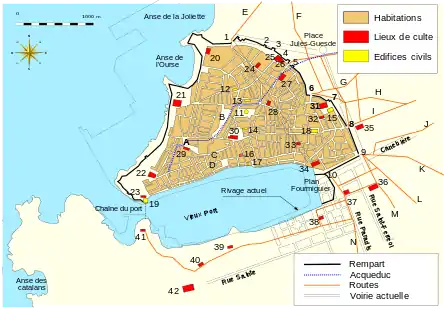 Marseille a initialement été fondée en -600 sur la rive nord de l'actuel Vieux-Port, à l'emplacement de l'actuel quartier du Panier. L'agora grecque se serait d'ailleurs située sur l'actuelle place de Lenche[1]. Des vestiges de la cité antique ont également été retrouvés derrière le Centre bourse et peuvent aujourd'hui être visités dans le Jardin des Vestiges.