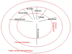 Au Moyen Âge, Paris repousse régulièrement les enceintes qui l'entourent et absorbe ses faubourgs : d'abord celle de Philippe Auguste, puis celle de Charles V.