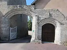 - Église Saint-Julien des XIe, XIIIe – XVIIIe siècles inscrite au titre des monuments historiques par arrêté du [25]. Le tympan du XIIe de la porte méridionale, décoré d'un centaure poursuivant un cerf de ses flèches[26],[Note 4], est classé au titre objet aux monuments historiques[27], ainsi qu'une Vierge à l'Enfant du XVIe, les statues de sainte Catherine d'Alexandrie du XVe, de saint Julien du XVIe, les stalles, lutrin, lambris de chœur et Crucifixion du XVIIIe[28]. Sont également conservés un bas-relief du XVe, un retable aux douze apôtres du XVe, une chaire à prêcher et confessionnal du XVIIIe, des fonts baptismaux du XVIIe[15].