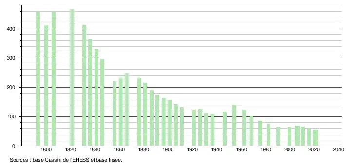 L'évolution du nombre d'habitants est connue à travers les recensements de la population effectués dans la commune depuis 1793. Pour les communes de moins de 10 000 habitants, une enquête de recensement portant sur toute la population est réalisée tous les cinq ans, les populations légales des années intermédiaires étant quant à elles estimées par interpolation ou extrapolation[18]. Pour la commune, le premier recensement exhaustif entrant dans le cadre du nouveau dispositif a été réalisé en 2005[19].