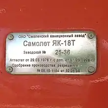 Plaque du fabricant sur un Yak-18.