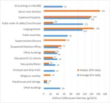 La part de l'utilisation totale d'eau par les hôtels et les motels dans les villes américaines varie de 3 % à Oakland, en Californie, et de 4 % à Austin, au Texas[11] à 13 pour cent dans l'État de Floride[10]. L'utilisation quotidienne moyenne dans les hôtels dépend du type et de la taille de l'hôtel et de la présence des principales utilisations finales de l'eau, y compris les tours de refroidissement, la blanchisserie sur place, la cuisine et la salle à manger, piscine et arrosage des pelouses. Par exemple, dans un échantillon de 706 hôtels de New York, l'intensité moyenne d'utilisation quotidienne de l'eau en 2011 variait de 60 à 456 gallons par 1000 pieds carrés (g/ksf/d), l'utilisation médiane étant de 215 g/ksf/d[11]. Dans d'autres régions, l'utilisation médiane par 1000 pieds carrés a été rapportée à: 257 gallons en Floride[10], et 219 gallons à Austin, au Texas[11]. Le gestionnaire de portefeuille de l'EPA Energy Star qui suit l'utilisation de l'eau dans les installations des CII a trouvé une utilisation médiane dans les hôtels de 102 gallons/chambre/jour[20]. Compte tenu de l'inventaire existant d'environ 5 millions de chambres d'hôtel dans le pays avec la superficie combinée de 3,319 millions de pieds carrés[31],[21], et en supposant une utilisation moyenne de 209 g/ksf/d[11], l'utilisation totale estimée de l'eau serait de 694 mgd soit environ 6 pour cent de l'utilisation de CII. Une façon populaire d'économiser l'eau dans les hôtels est d'encourager les clients à réutiliser les serviettes et les draps afin de réduire la quantité d'eau utilisée dans la blanchisserie de l'hôtel et de moderniser les chambres avec des robinets, pommes de douche et toilettes étiquetés EPA WaterSense[32].