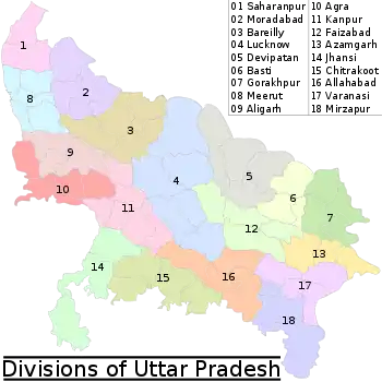 L'Uttar Pradesh est divisé en 75 districts regroupés en 18 divisions territoriales[46]: